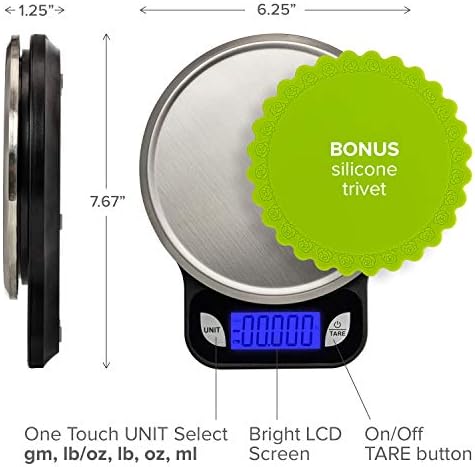 ✌ GREAT VALUE – Register your purchase to guarantee the batteries for a year! INSIDE THE BOX: kitchen scale; batteries; food grade silicone trivet – keeps the weighing surface clean – doubles as a hot pad or jar opener; Instruction and Care Guide written in plain English; product inserts show how to register and choose a charity – a % of your purchase goes to the charity of your choice; how to contact our US-Based Customer Support team to answer any question you have.