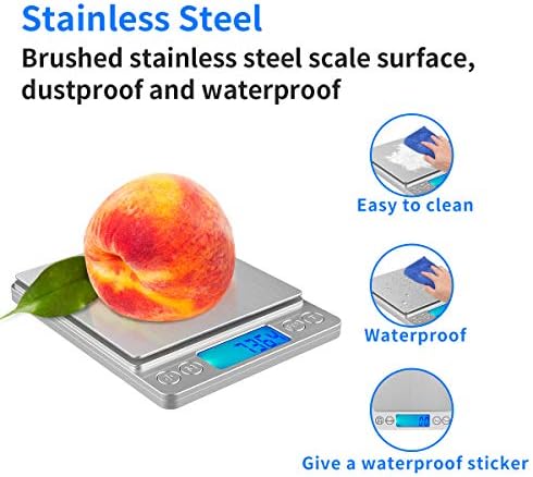 HIGH-QUALITY MATERIAL – The scale surface of the digital scale is made of stainless steel, which is easy to clean and durable. The keys are made of plastic with waterproof stickers to prevent liquid from entering the scale through the keys