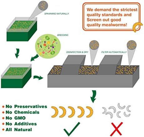 HEALTHY & NO PRESERVATIVES OR OTHER CHEMICALS – Our mealworms receive a well-monitored diet of grains, vegetables and cereals. These sources are never blended with animal matter. We demand the strictest quality standards and our worms never eat any GMOs.