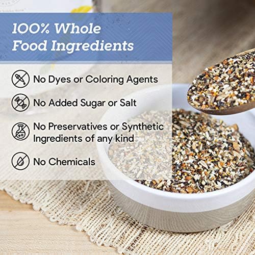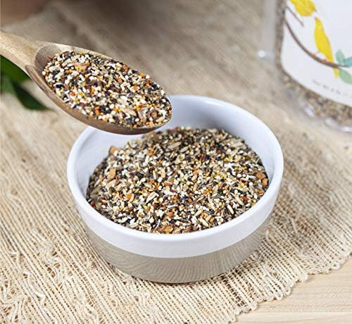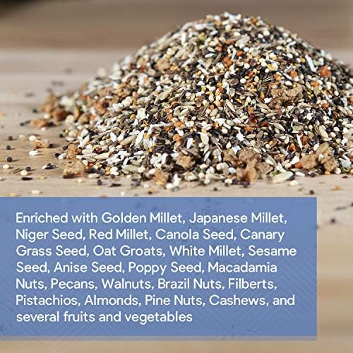 Enriched with Golden Millet, Japanese Millet, Niger Seed, Red Millet, Canola Seed, Canary Grass Seed, Oat Groats, White Millet, Sesame Seed, Anise Seed, Poppy Seed, Macadamia Nuts, Pecans, Walnuts, Brazil Nuts, Filberts, Pistachios, Almonds, Pine Nuts, Cashews, Apple, Coconut, Carrots, Orange Peel, Soybeans, Greens Beans, Broccoli, Zucchini, Peas, Red Bell Peppers, Green Bell Peppers, Celery, Spinach, and Parsley