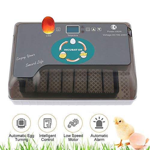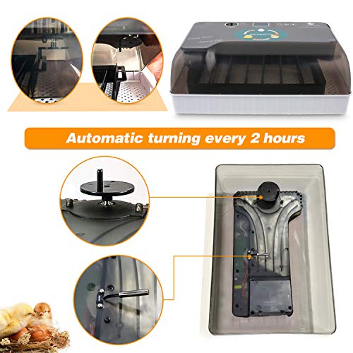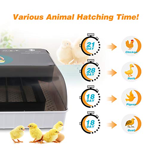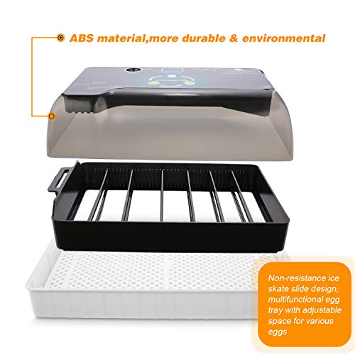 MORE FUNCTION: High intensity egg candling lamp for monitoring egg development. Basket-like hollow egg tray ensures good air circulation; Over temperature & humidity alarm to protect the eggs; low noise, low power consumption and more.