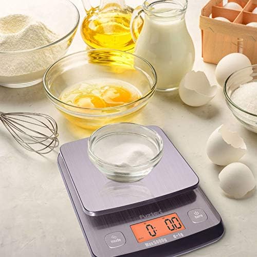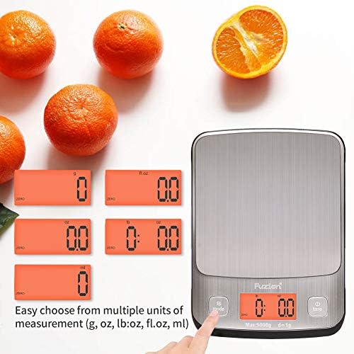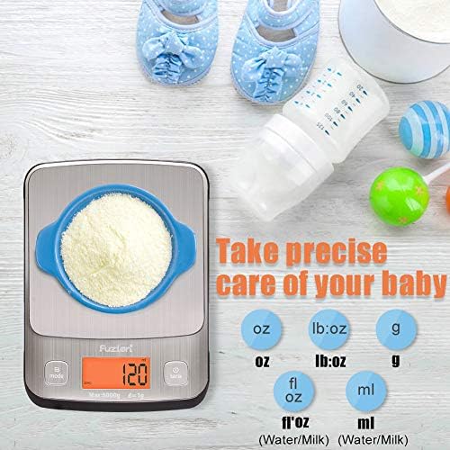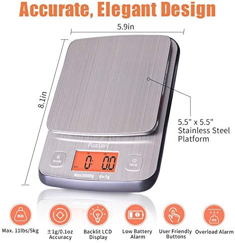 ACCURATE & WIDE RANGE: High quality sensors ensure the increments reading of 1g/0. 1oz. Max weight capacity: 5000g/11lb. Min weight recommendation: 3g. This food scale also has 5 available measuring units(g, oz, lb:oz, fl.oz, ml), milk and water measurement modes included.