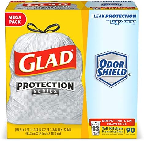 GARBAGE CAN LINER: Glad 13 gallon trash can liners ensure a tight grip on the garbage can making for a simple removal with a quick cinch of the durable drawstring