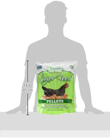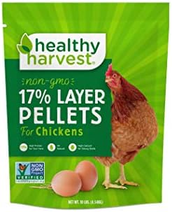 Healthy Harvest 17% layer pellets made with non-GMO grains and fortified with essential amino acids in a 10 pound bag with a Zip seal