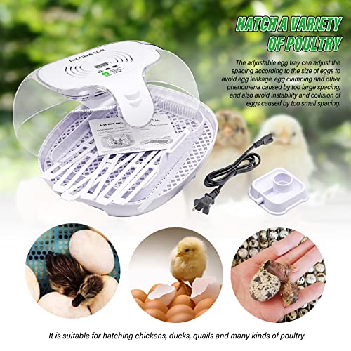 AUTOMATIC EGG TURNER: Adjustable shaft spacing for incubating different size eggs.Automatic egg turning can avoid adhesion of eggshells and egg trays, and improve hatchability. It also saves you the time of looking after the eggs. Detachable turning plate even the base can be removed for easy clean up.