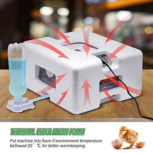 STABLE TEMPERATURE: Built-in fan, low noise, fan-assisted airflow/circulating air, uniform heating of fertilized eggs.The outer packaging has a 0.9-inch thick foam protector, which can prevent heat loss during the incubation period in cold winter.