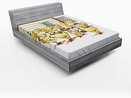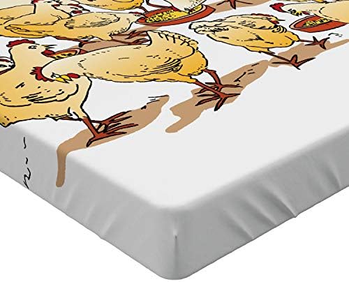 Lunarable Chicken Fitted Sheet, Flock of Hens in a Farm Eating from Food Bowls Colorful Cartoon Style Illustration, Soft Decorative Fabric Bedding All-Round Elastic Pocket, Full Size, Yellow Amber