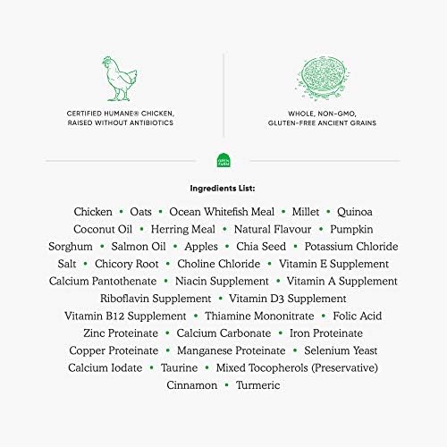 Featuring a handcrafted blend of whole gluten-free ancient grains including steel-cut oats, sorghum, quinoa, and chia seeds paired with farm fresh produce like pumpkin, apple, and chicory root, Open Farm always favors real non-GMO ingredients over fillers like potatoes, legumes, corn, soy, and wheat.