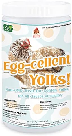 Your hen’s eggs are only as good as her diet. Provide extra beta-carotenes and omega-3 fatty acids with Pampered Chicken Mama’s Egg-cellent Yolks chicken egg supplement by just adding to your hen’s existing diet. Just mix Egg-cellent Yolks with your favorite poultry mash, organic chicken feed for laying hens, scratch for chickens, laying pellets for chickens, rooster feed, grit, chicken feed, seed for chickens, mango worms, or duck feed for a great layer boost! This chicken treat for hens is made with organic herbs, sustainably sourced grains, and ground black soldier fly grubs (also known as grubbies for chicken). Also easy to mix with dried mealworms for birds (5lbs boxes). Filled with healthy omega fats, calcium for chickens, this treat also includes giant meal worms and grubs for chicken. Your hens will cluck for joy – and you’ll love how golden their yolks are!