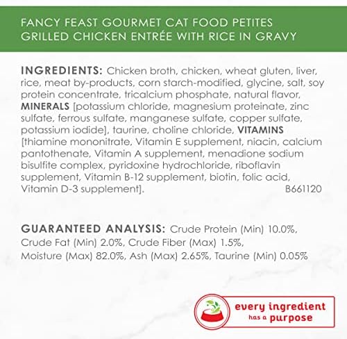 Delight your feline friend with the purr-worthy poultry flavor in each perfectly sized serving of Purina Fancy Feast Petites Grilled Chicken Entree With Rice in Gravy gourmet wet cat food. This gravy-filled ravishing recipe comes in fuss-free, snap-apart containers for your convenience. Just break the Fancy Feast wet cat food trays into two containers and serve your cat a tasty dish. Each single-serving cat food tray delivers a no mess, no leftover entree that lets you get back to what’s truly important: spending quality play time with your cat. Serve your little connoisseur an elegant dish made with real grilled chicken along with an appetizing rice and silky gravy for a decadent, gourmet cat food worthy of her impeccable preferences. Purina Fancy Feast Petites Grilled Chicken Entree With Rice in Gravy gourmet wet cat food has no artificial colors or preservatives for a recipe you can feel good serving.