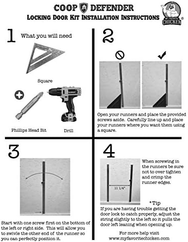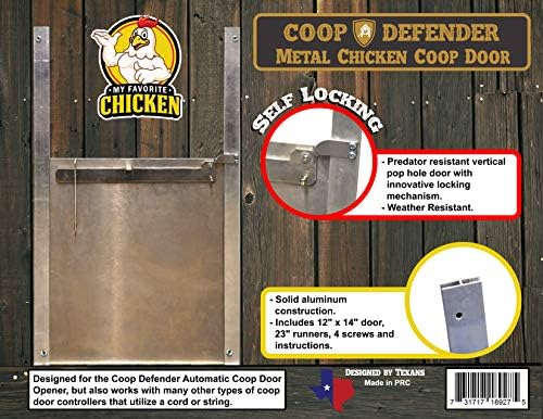 Perfect size door opening for most breeds of poultry and duck. Approximately 12″ wide by 14″ tall, weighs under 2 lbs. Runners are about 24″ tall. Comes with 4 wood screws.