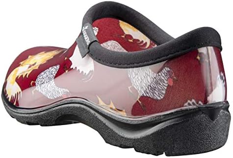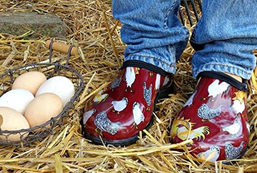 Slip-on rain-and-garden shoe with waterproof rubber upper featuring allover barnyard motif