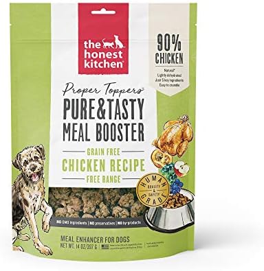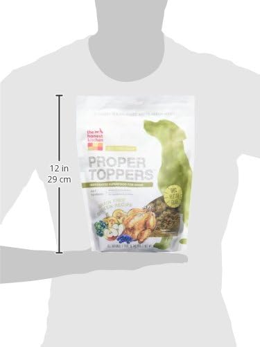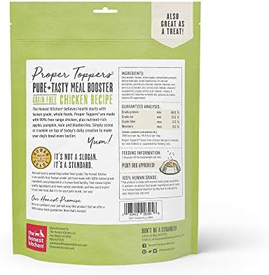 About proper toppers grain-free chicken dog food: The Honest Kitchen chicken proper toppers are irresistible, light and crispy superfood clusters. They’re uber delicious, while providing a boost of whole food, superfood nutrition. Proper toppers are made with just 5 dehydrated dog food ingredients, including free-range chicken, and are 90% meat. These superfoods for dogs will boost taste and add nutrition to tired old kibble. They can also be served as a tasty treat. Crumbs at the bottom of the bag? These savory sprinkles are just as good as the clusters! This natural dog food is 100% human-grade dog food (an important quality distinction!) and contains no Red flag pet food ingredients like corn, soy, rice, beet pulp or wheat. About the Honest Kitchen: the Honest Kitchen started in Lucy Postin’s kitchen in 2002 when she started making her dog’s meals from scratch to help combat his ear infections. The physical difference from his new diet was spectacular but her kitchen was a mess. Lucy then realized that dehydrating whole foods made mealtimes much simpler while maintaining the natural health benefits of the ingredients. From there, The Honest Kitchen was born – and her kitchen stayed much cleaner! Today, the Honest Kitchen is on a mission to revolutionize the pet food industry through their obsession with product integrity and commitment to help as many pets as possible get on the road to good health through natural, wholesome proper food.