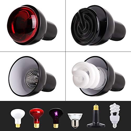 Can be equipped with E26/E27 screw base light bulbs, ceramic heat lamps, UVA/UVB infrared emitters (Caution: Light bulb‘s power at 250-Watt or less, or in the range of 250℃ above the surface temperature of the bulb/lamp.)